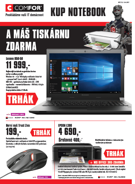 POZOR! Kromě časově omezené AKCE „Kup notebook a máš tiskárnu ZDARMA“ pro Vás máme do 2. 4. spoustu dalších TRHÁKŮ za super ceny! Přijďte si k nám třeba pro herní myš Trust Ziva s ergonomickou konstrukcí a LED podsvícením nebo pro externí disk pro extrémně rychlý přenos dat s kapacitou 750 GB a bezplatným softwarem. Další TRHÁKY najdete na eshop.metropolitka.cz. Příjemné nakupování Vám přeje Váš Humlík.